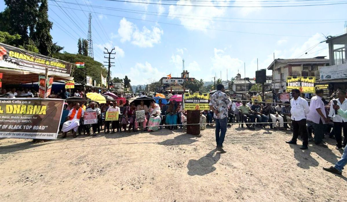 General Public Stages Massive Protest, Chakka Jam at Rangat Bazaar Demanding Immediate Black-Top Road Work by NHIDCL
