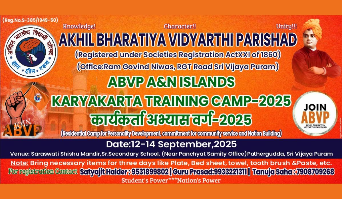 The Akhil Bharatiya Vidyarthi Parishad (ABVP), a registered nationalist students’ organisation established in 1949, will be organising a three-day residential Karyakarta Abhyas Varga (training camp) from September 12 to 14, 2025, at Saraswati Shishu Mandir School, near Panchayat Samiti Office, Pathergudda, Sri Vijaya Puram.