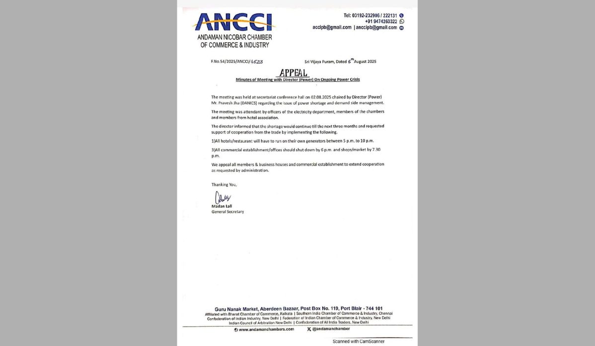 The Andaman & Nicobar Chamber of Commerce & Industries (ANCCI) has urged all its members, business houses, and commercial establishments to cooperate with the Administration in light of the ongoing power shortage affecting the islands.