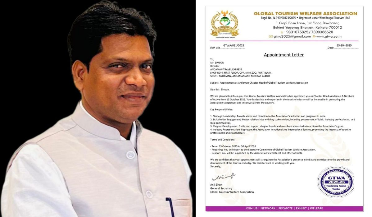 The Global Tourism Welfare Association (GTWA), has appointed Mr. Simson as the Chapter Head for the Andaman & Nicobar Islands. The appointment took effect from October 15, 2025.