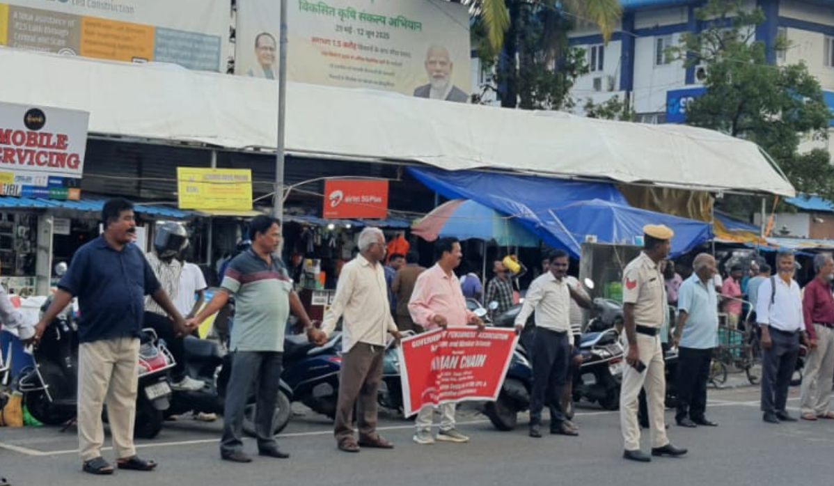 In Sri Vijaya Puram, the Government Pensioners Association of the Andaman & Nicobar Islands organized the Human Chain demonstration near Tiranga Park, Aberdeen Bazar. A large number of pensioners, including women, participated in the peaceful protest.